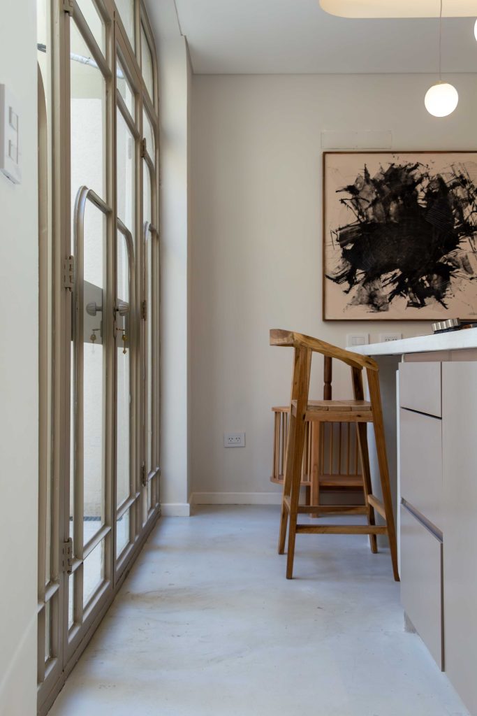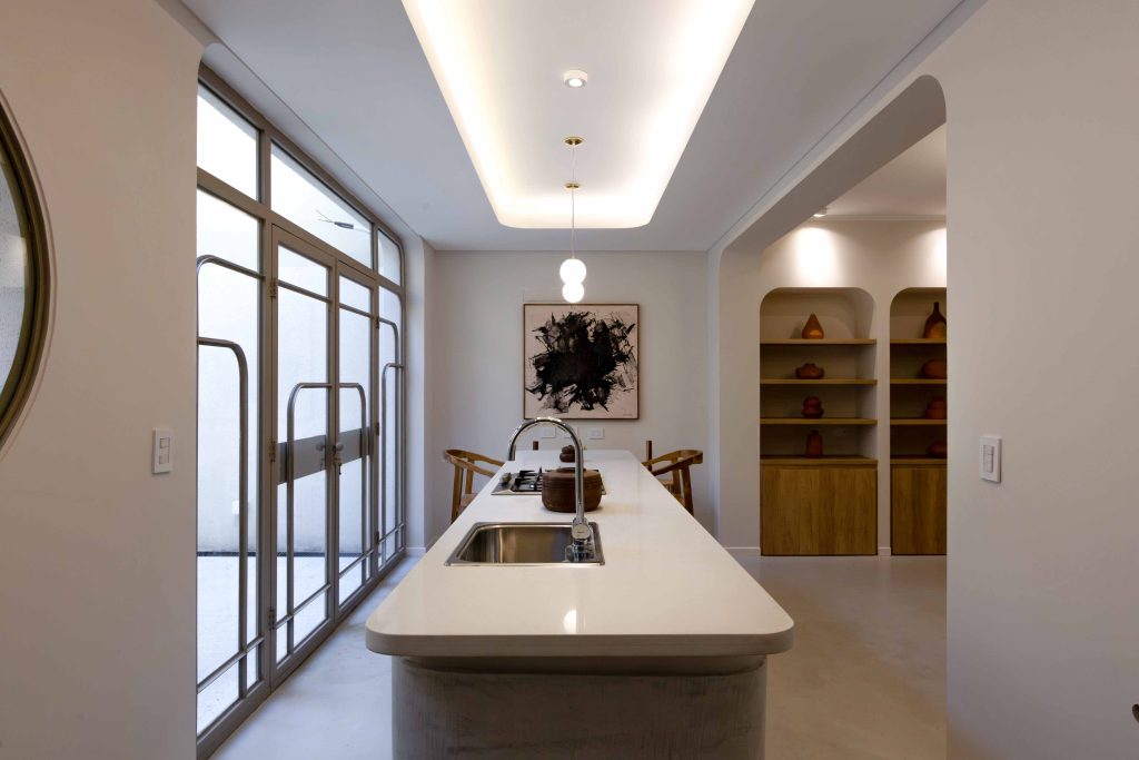Este proyecto consistió en la reforma integral de una vivienda de tres dormitorios, situada en el microcentro de Rosario. El reto principal fue conseguir una mayor luminosidad y amplitud en el living-comedor, al mismo tiempo que se optimiza el espacio de la cocina, destacando la isla como elemento central. Se conservan elementos originales, como la fachada, la escalera de madera, las puertas interiores y la distribución de la planta alta.